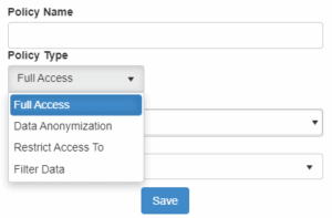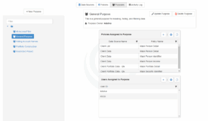 The platform supports different policy types: Data Anonymization, Full Access, Restricted Access To, and Filter Data. Purposes (or projects) can contain a set of policies, and users can then be assigned to these purposes.