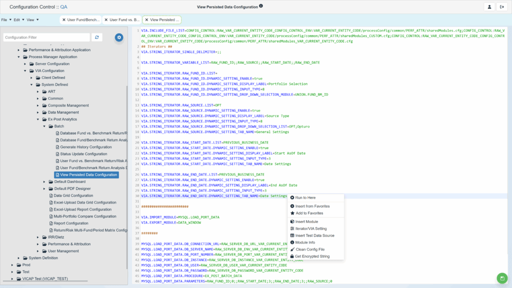 The Configuration Control module ensures version control, storing and tracking unlimited configuration versions with detailed audit trails. Visualize processes using Flow Diagrams and test sections independently using the unique “run to here” functionality. Run scripts directly within the module for streamlined operations. Utilize preconfigured templates to accelerate custom configuration setups. Also allows for the efficient migration of configurations from development to production environments.